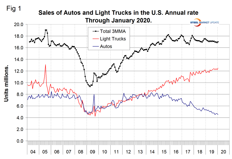 Figure 1 shows auto and light truck sales since January 2004. In January 2020, total sales were down by 2.3 percent on a three-month moving average (3MMA) basis year over year. Light trucks that include pickups, SUVs and crossovers have been surging at the expense of cars for four years. In January, the mix was 73.5 percent light trucks and 26.5 percent autos. This was the highest proportion ever for light trucks, and there is no sign of the trend slowing. In 2019, import market share had a high of 23.5 percent in October and declined to 21.8 percent in January 2020 as shown in Figure 2.