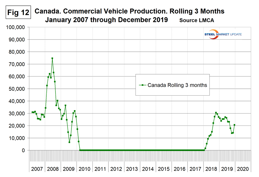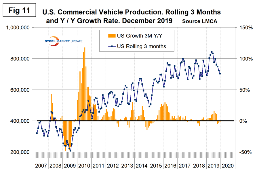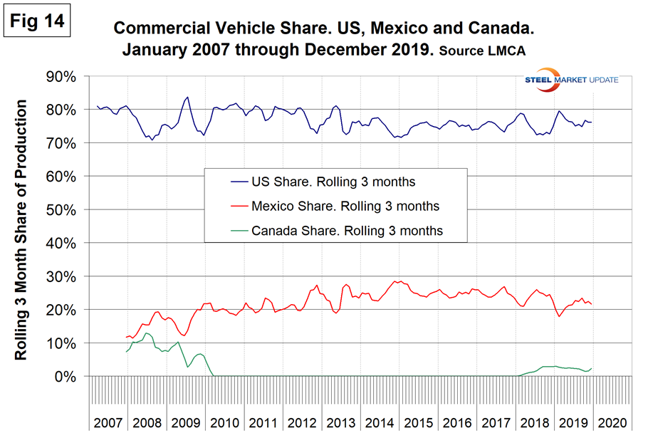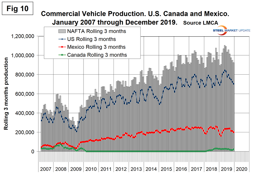 Figure 10 shows the total commercial vehicle production for North America and the total for each nation. The U.S. has held its ground much better in commercial vehicles than in the personal segment.