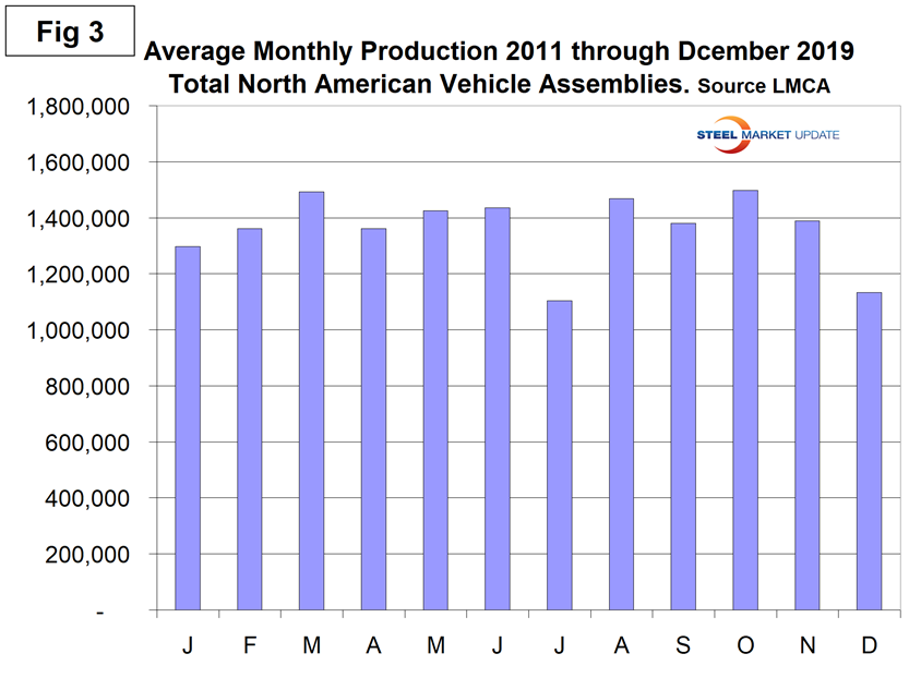 Total light vehicle (LV) production in North America in December was at an annual rate of 13.2 million units, down from 17.2 million in November. On average since 2007, December’s production has been down by 18.5 percent from November. This year production was up by 23.5 percent, therefore worse than normal. Figure 3 illustrates the seasonality of production on average since January 2011. On a rolling 12-months basis, total North American assemblies were down by 3.8 percent year over year through December. Note that production numbers are not seasonally adjusted; the sales data reported above are seasonally adjusted.