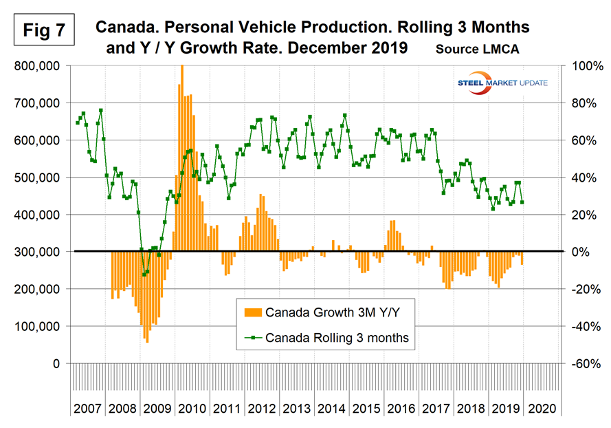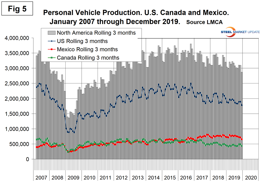 The longer-term picture is shown in the following charts by vehicle type and nation. Figure 5 shows the total personal vehicle production for North America and the total for each nation.