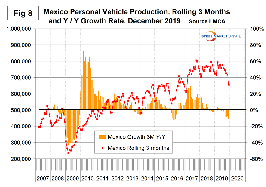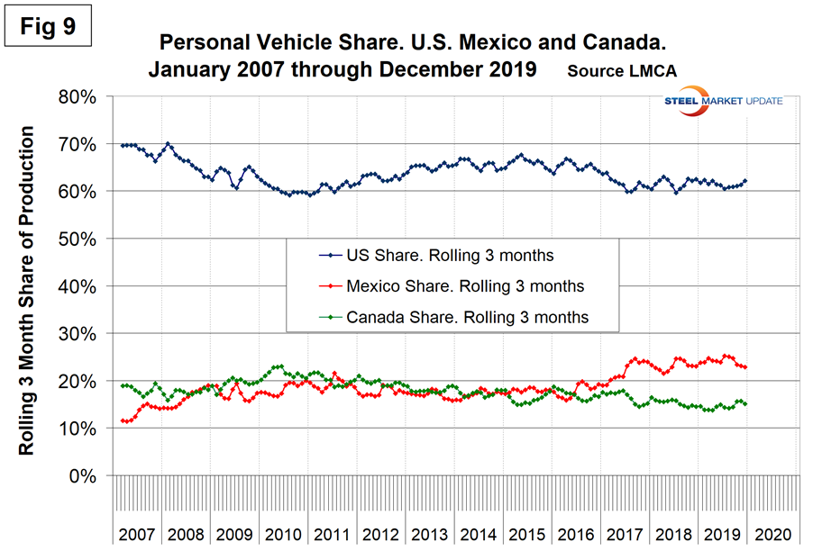 Figures 6, 7 and 8 show the production of personal vehicles by nation and the year-over-year growth rate for each. Figure 9 shows the production share for each nation. Production in the U.S. has been declining since 2016 and in Canada since 2017. Mexican production has been erratic but making no progress since the end of 2017. The U.S. share rose for five months through December to 62.1 percent as Mexico’s share fell for five months to 22.8 percent.