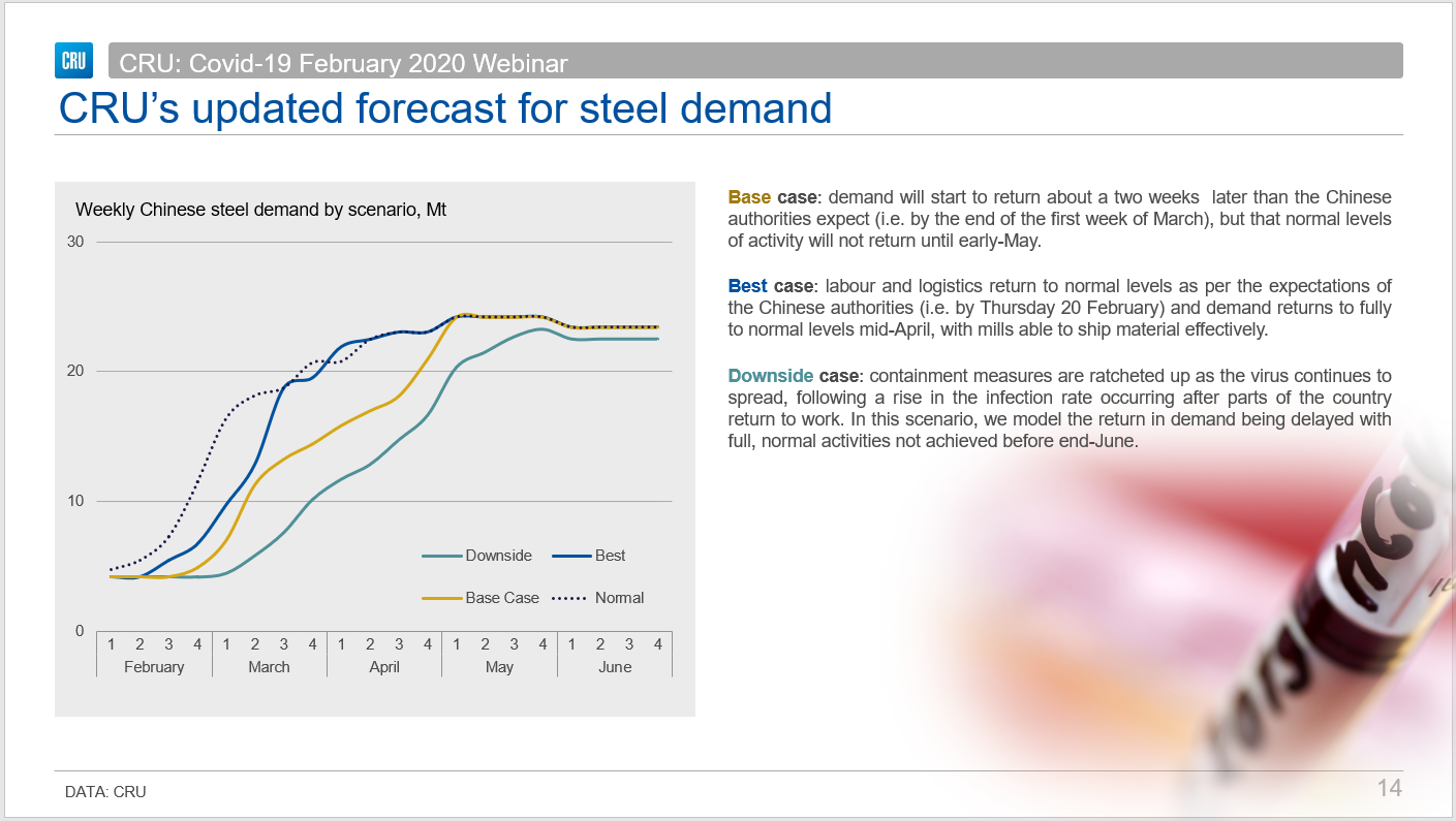 CRU envisions three possible scenarios for how the situation could play out. In the best case, the epidemic could end rapidly and business could normalize by the first part of March. In the worst case, disruptions will continue to plague commerce until late May. CRU’s base case, the one considered most likely, calls for demand to return to normal by late April (see chart).