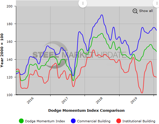 While the overall Momentum Index has declined for two consecutive months, it remains 11 percent higher on a year-over-year basis. The commercial component is 20 percent higher than a year ago, while the institutional component is 2 percent lower. This continues to suggest that construction activity should remain near its recent highs in 2020, said Dodge.