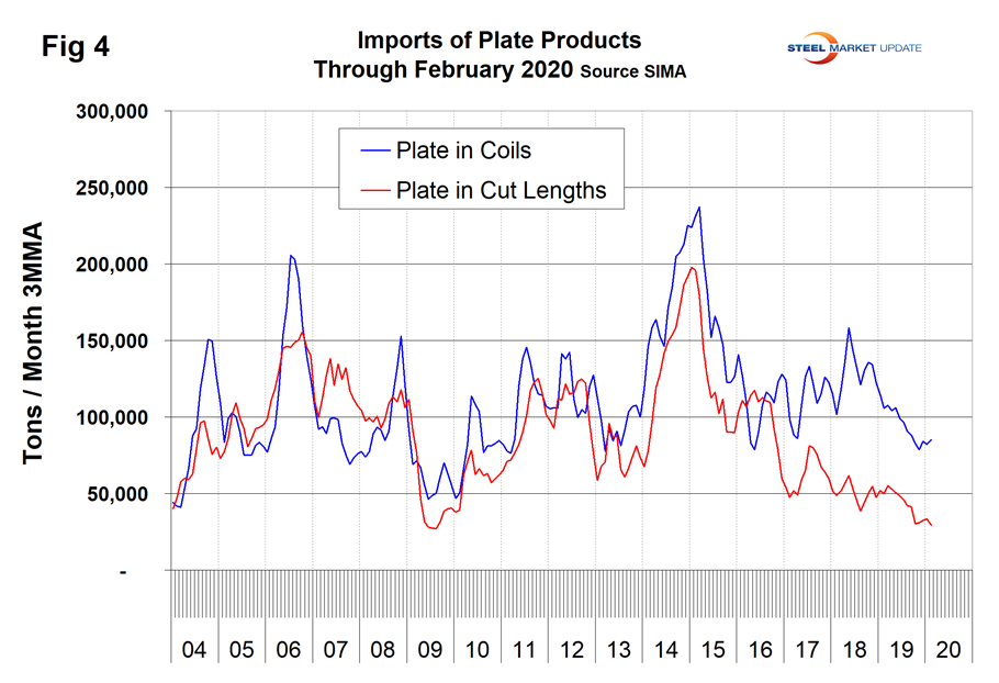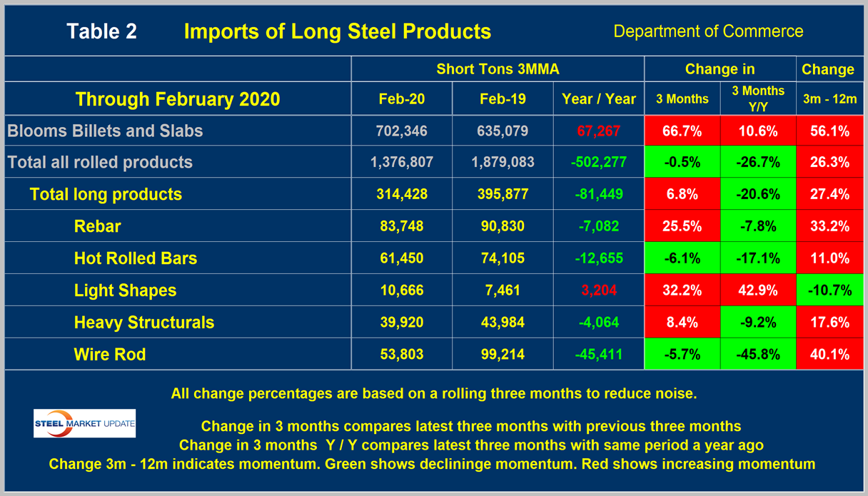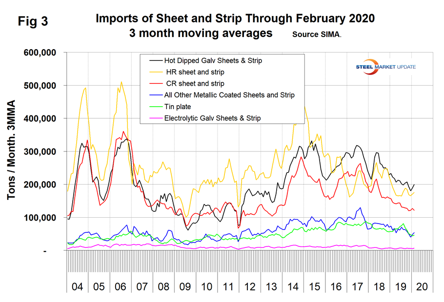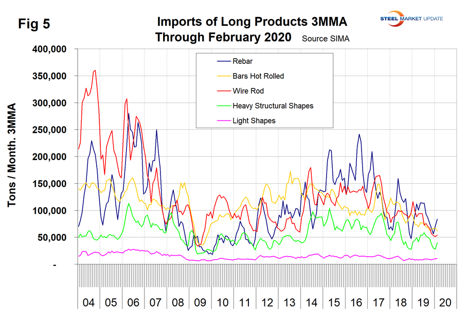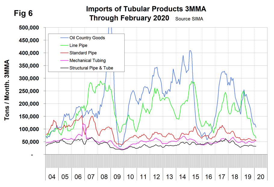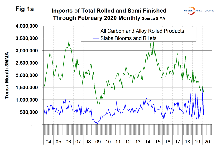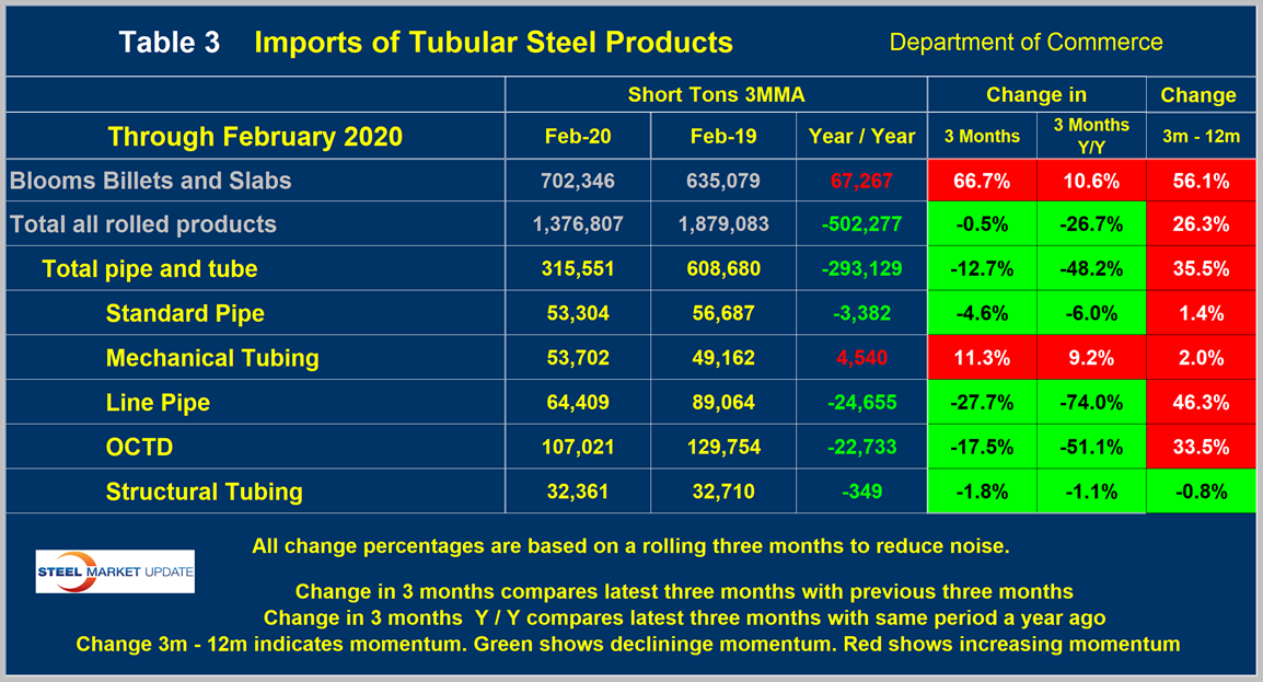 Imports of total rolled products in February were the lowest since February 2010 on a single-month basis and since March 2010 on a 3MMA basis. In the 12 months August 2018 through August 2019, total rolled product imports on a 3MMA basis were consistently in the range of 1.70 to 1.94 million tons. In the months September through February, the new normal has been a range of 1.25 to 1.56 million tons with a February volume of 1.30 million. Year over year on a 3MMA basis, sheet products were down by 10.6 percent, plate products were down by 26.7 percent, long products were down by 20.6 percent and tubulars were down by 48.2 percent. Imports of flat rolled, tubulars and longs all had a recent peak in May 2018. Since then total flat rolled, (sheet + plate) imports have consistently declined, which may be tariff driven. This is not so obvious for longs and tubulars where the decline since May 2018 has been less consistent.