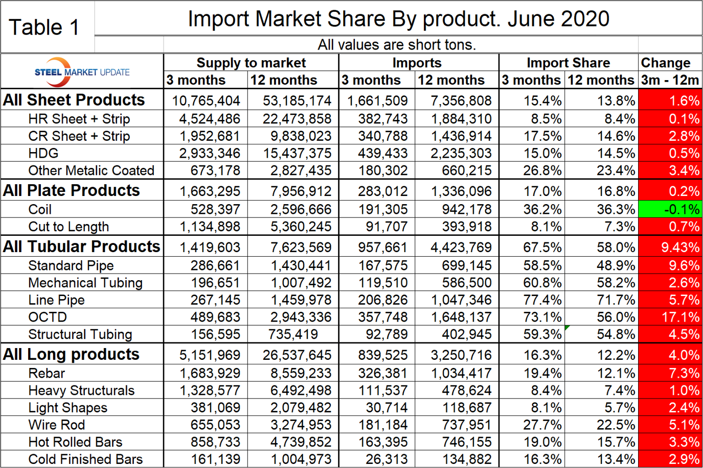 Table 1 shows total supply to the market in three months through June and in 12 months through June for the four product groups and the 16 subcategories. Supply to the market is the total of domestic mill shipments to domestic locations plus imports. It shows imports on the same three- and 12-month basis and then calculates import market share for the two time periods for 16 products. Finally, it subtracts the 12-month share from the three-month share and color codes the result green or red. If the result of the subtraction is positive, it means that import share is increasing and the code is red. The big picture is that import market share increased in three months compared to 12 months for all of the 16 products considered except coiled plate.