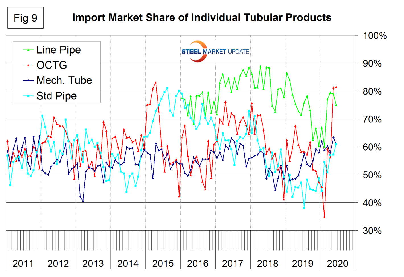 Figure 9 shows the import market share of the individual tubular products. Based on the available information, all are very high compared to other steel product groups. Since early 2016, line pipe had the highest import market share, but in May and June the share of OCTG more than doubled and took the top spot. This was due to a collapse in the domestic shipments of this product. We hope that the errors in the tubular data are consistent and the shape of the curves in Figure 9 is useful to industry professionals.