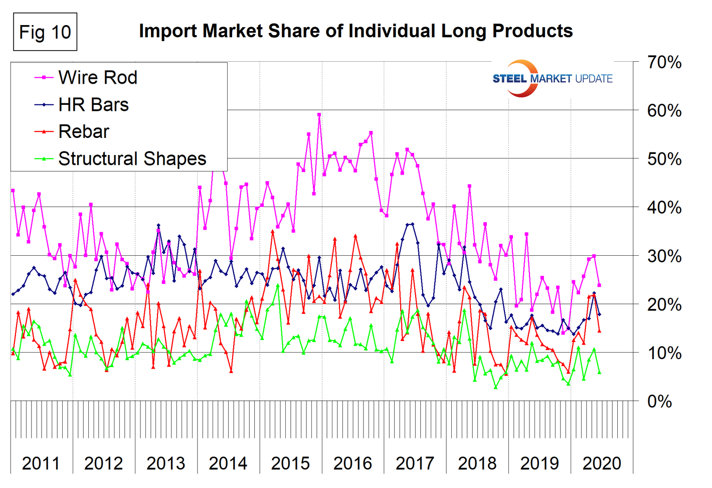 Figure 10 shows the detail for the four major sectors of the long product group. Wire rod plus drawn wire still suffer from the highest import volume, but the differential with other long products has declined since mid-2017. Rebar has been very erratic. The import share fell to a historically low level in December 2019, but since then has doubled. The import market share of structural shapes declined in the second half of 2019, but has since increased.