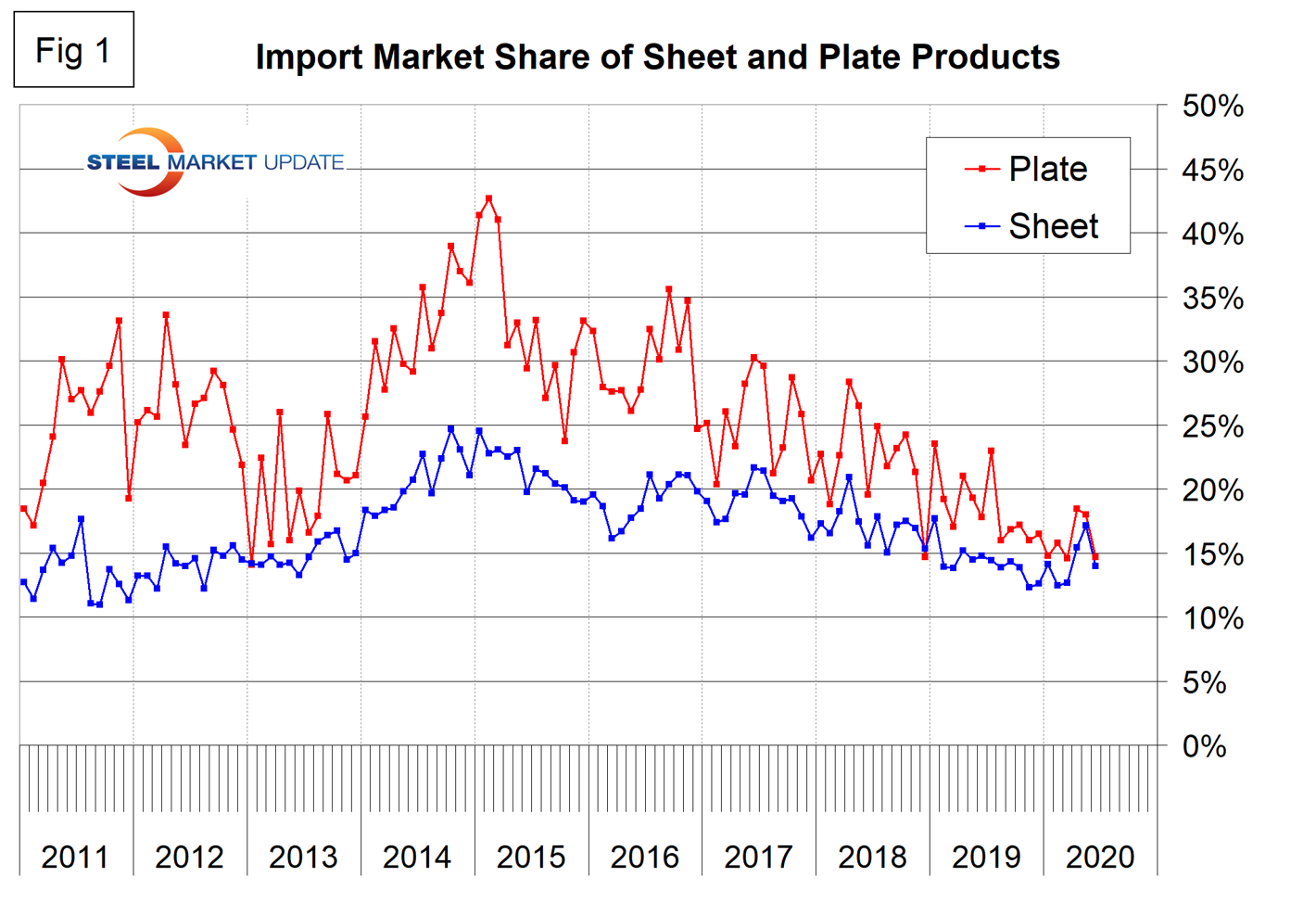 Figure 1 shows the historical import market share of plate and sheet products. The import share of plate has been decreasing erratically since February 2015. Sheet product import share has been relatively stable for a year and a half.