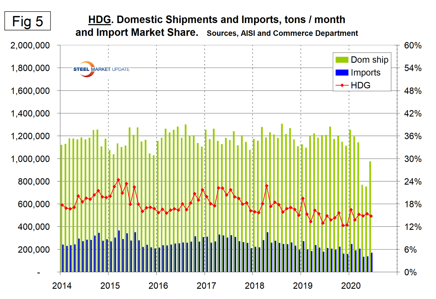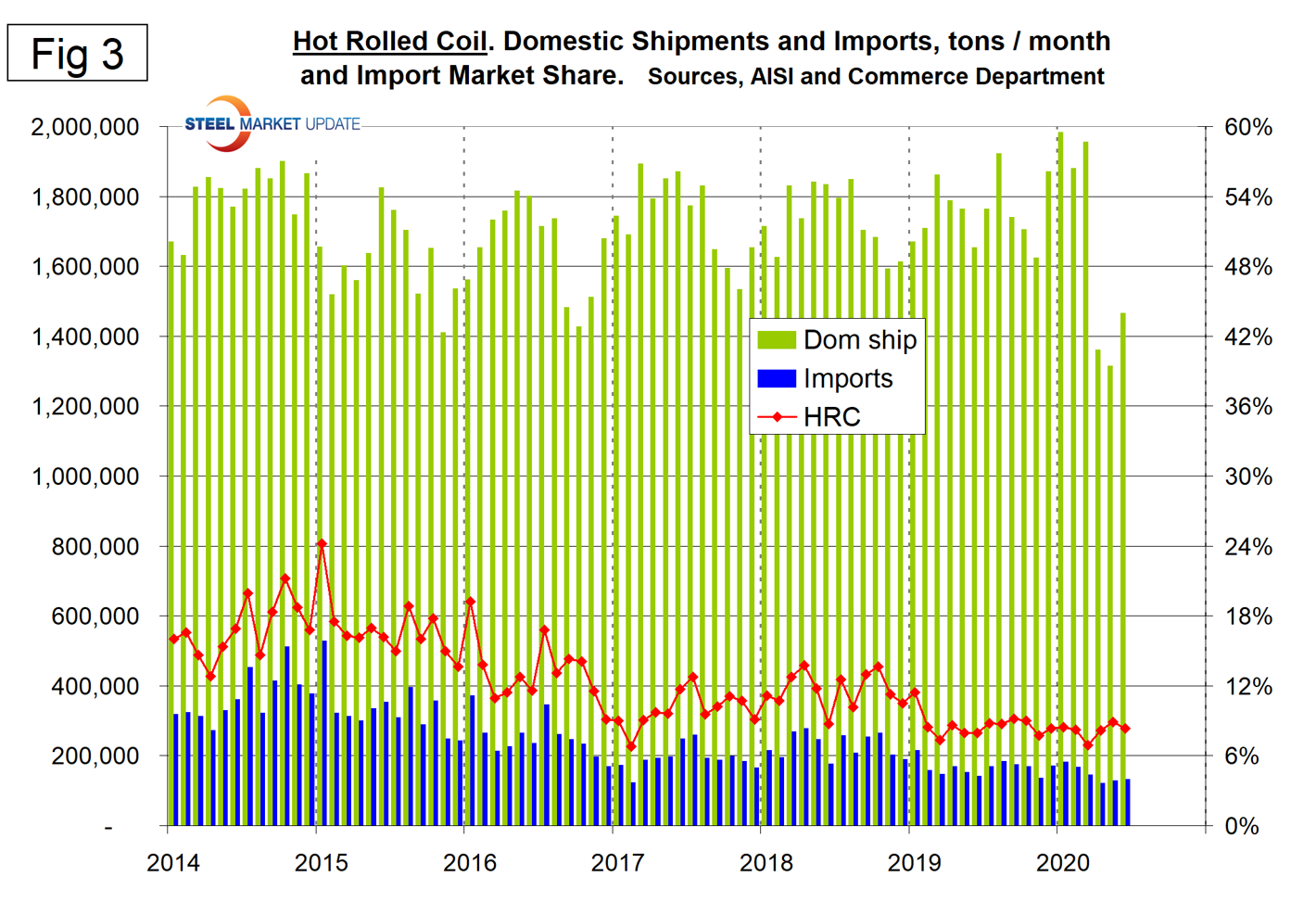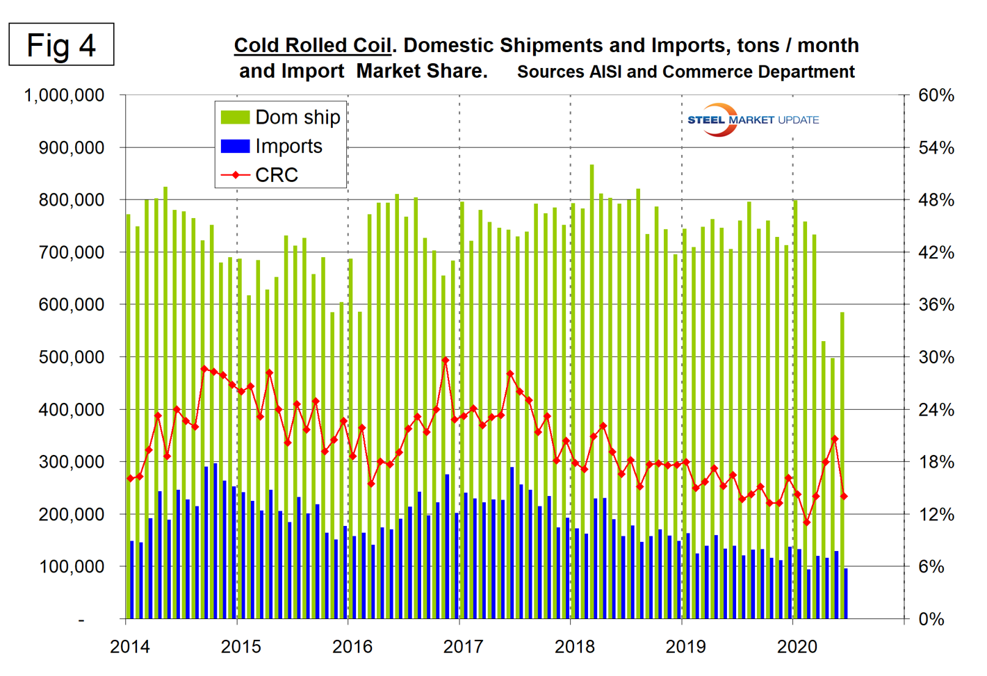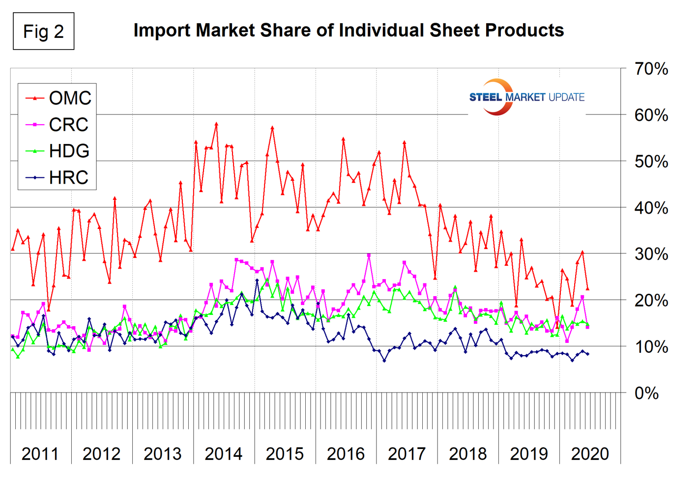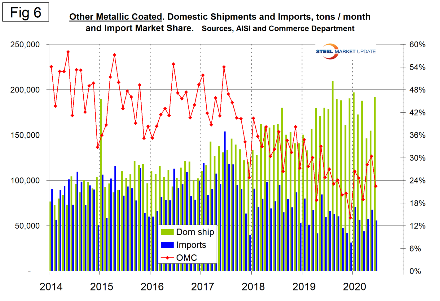 Figures 3, 4, 5, and 6 show domestic shipments, imports and import market share for the four major sheet products. OMC has traditionally had by far the highest import share and that is still the case.