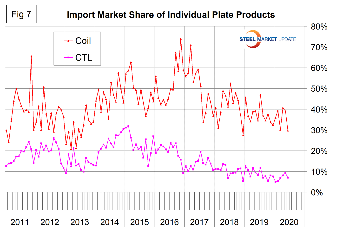 Figure 7 breaks out coiled and discrete plate from the flat rolled total and shows that coil imports have almost four times the import market share of CTL imports.