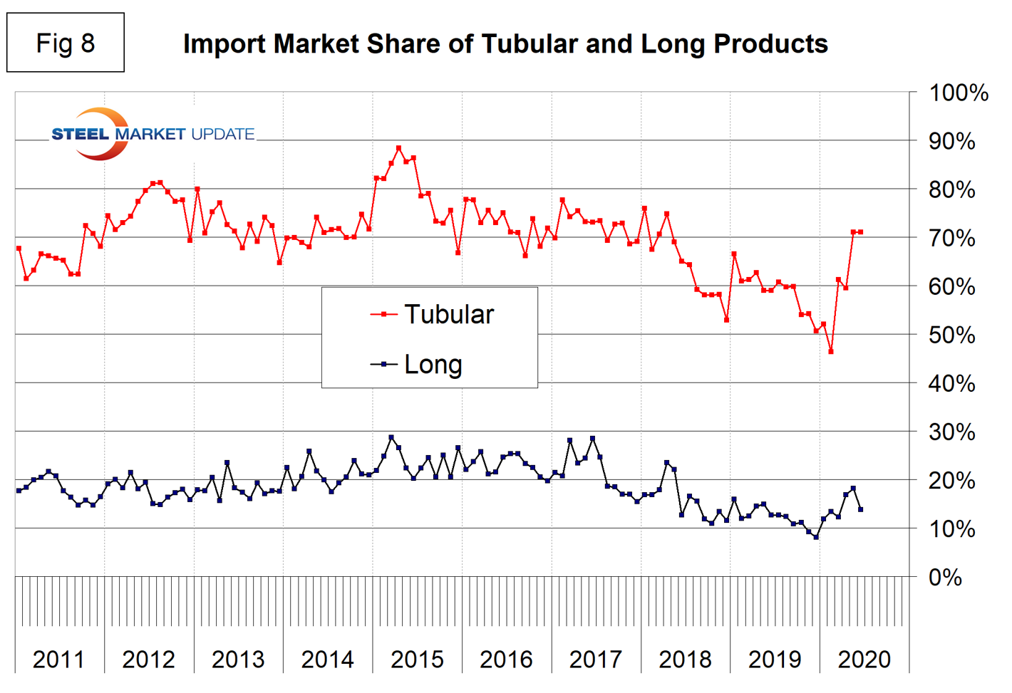 Figure 8 describes the total import share of tubular goods and long products. It is evident as we work the numbers that data for the domestic production of tubulars is greatly understated. This is probably because of a more fragmented supply chain and the independent tubers not reporting to the AISI to the extent that the steel mills do for other products. This has the result of increasing the apparent import market share. Even though we don’t believe these numbers for tubulars, we are including them here in the belief that trends should still have some validity. Since May 2018 the import market share of long products has been historically low.