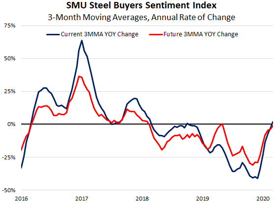 The goal of SMU’s index is to measure how buyers and sellers of steel feel about their company’s ability to be successful today (Current Sentiment Index), as well as three to six months into the future (Future Sentiment Index). Results from SMU’s market trends questionnaire this week are posted as both single data points and as three-month moving averages (3MMAs) to smooth out the trend.