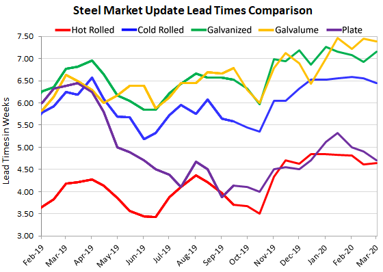 Comparing the data, the average lead time for spot orders of hot rolled this week was 4.64 weeks, up slightly from 4.61 weeks in mid-February. Cold rolled was at 6.44 weeks, down slightly from 6.55 weeks two weeks prior. Galvanized was at 7.16 weeks, up slightly from 6.93, while Galvalume was at 7.38 weeks, down from 7.45. The average plate lead time this week was 4.71 weeks, slightly shorter than the 4.90 weeks in the prior survey.