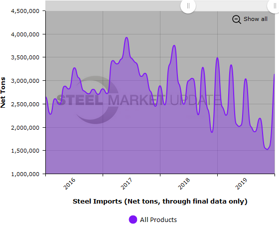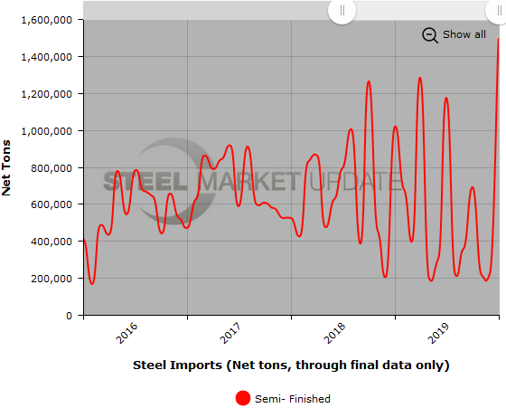 Semi-finished imports jumped to a record 1.5 million tons in January, whereas 1.0 million tons were brought into the country in January 2019. To smooth out the monthly swings, the 2019 monthly average for semi-finished steels was 560,000 tons per month, down from 650,000 tons per month in 2018 and down from 690,000 tons in 2017.