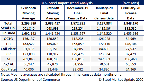 The table below shows total steel imports through final January data. For comparison, in January 2019, 3.5 million tons of steel were imported. The 2019 monthly average was 2.3 million tons per month, while 2018 averaged 2.8 million tons per month and 2017 averaged 3.2 million tons per month.