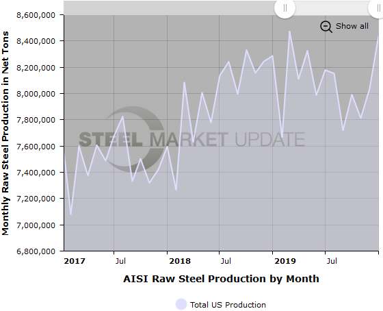 U.S. raw steel production in January rose to a 10-month high at 8,439,441 net tons, reported the American Iron and Steel Institute in Washington. January production was above the 2019 average of 8,061,679 tons and up 1.8 percent compared to the same month last year. The last time production was this high was March 2019 at 8,472,311 tons.