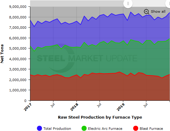The chart below shows total monthly steel production (blue) broken down by electric arc furnace production (green) and blast furnace production (red).