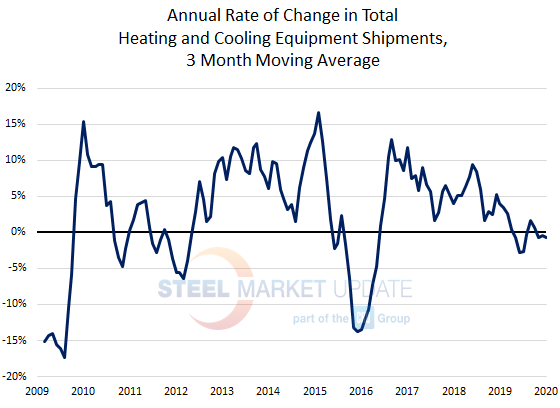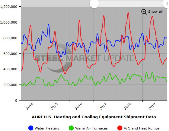 Below is a graph showing the history of total water heater, warm air furnace and air conditioner shipments. You will need to view the graph on our website to use it’s interactive features; you can do so by clicking here. If you need assistance with either logging in or navigating the website, contact info@SteelMarketUpdate.com.