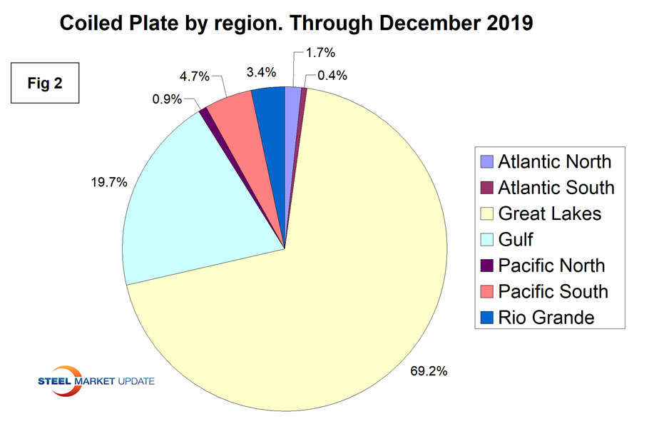 These six reports are intended to be reference documents with very few specific comments. The charts tell the whole story. Our intent is to provide buyers and sellers with an understanding of what is going on in their region of operation. Figure 1 shows the YTD tonnage of cold rolled plate into each region and the huge variation between them. Figure 2 presents the same data as a pie chart. By far the highest volume region in 2019, YTD December, was the Great Lakes, which accounted for 69.2 percent of the total. All other regions except the Gulf received minimal tonnage.