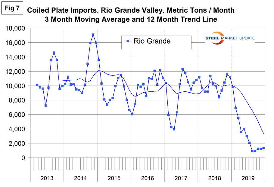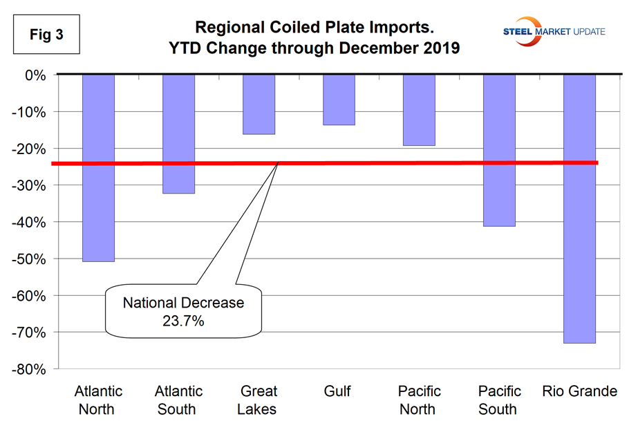 Total coiled plate imports, YTD December, were down by 23.7 percent and decreased in all regions with the Rio Grande being down the most.