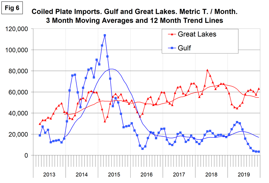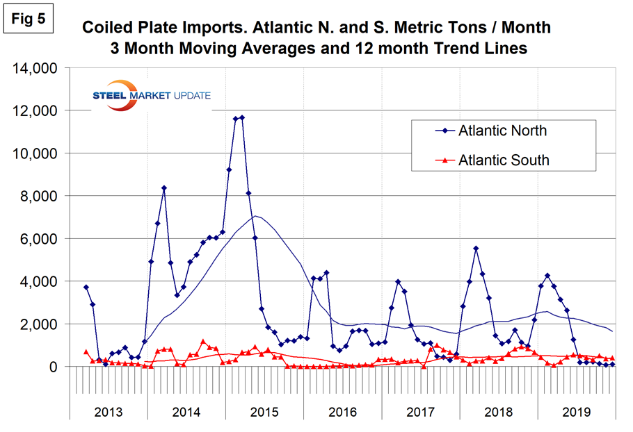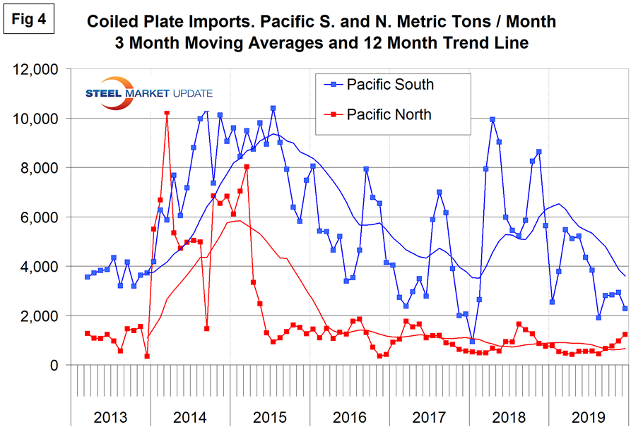 Figures 4, 5, 6 and 7 show the history of coiled plate imports by region since March 2013 on a three-month moving average basis. Note, the Y axis scales are not the same.