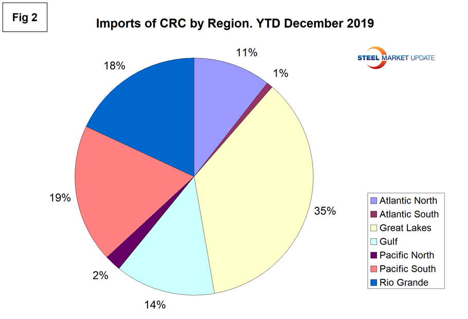 These six reports are intended to be reference documents with very few specific comments. The charts tell the whole story. Our intent is to provide buyers and sellers with an understanding of what is going on in their region of operation. Figure 1 shows the YTD tonnage of cold rolled sheet into each region and the huge variation between them. Figure 2 presents the same data as a pie chart. By far the highest volume region in 2019, YTD December, was the Great Lakes, which accounted for 51.3 percent of the total. The Pacific North and Atlantic South received minimal tonnage.