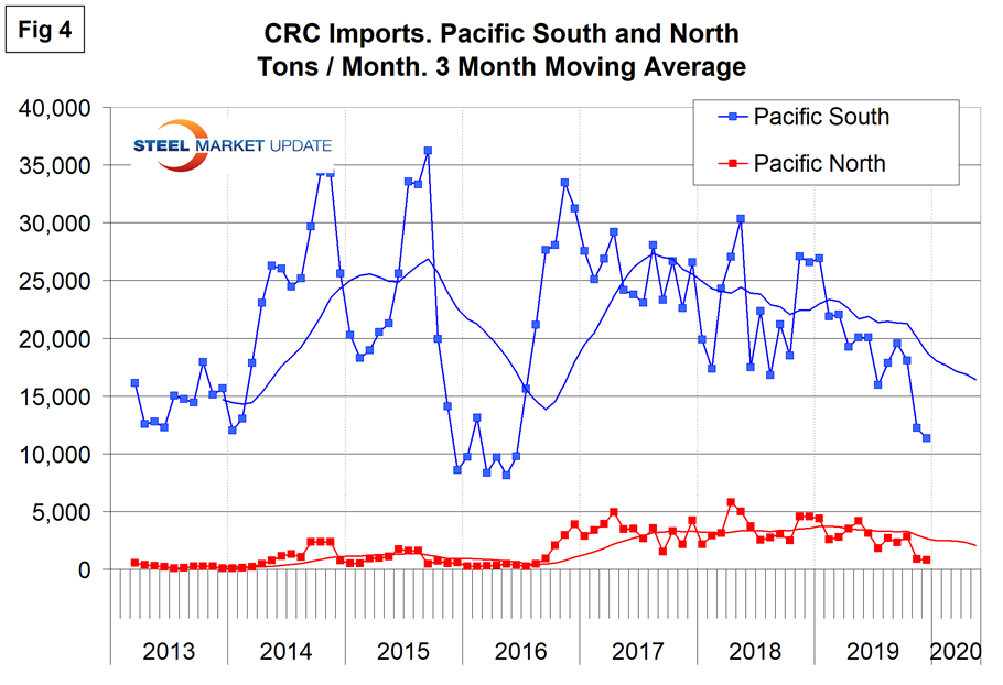 Figures 4, 5, 6 and 7 show the history of cold rolled coil imports by region since March 2013 on a three-month moving average basis. Note, the Y axis scales are not the same.