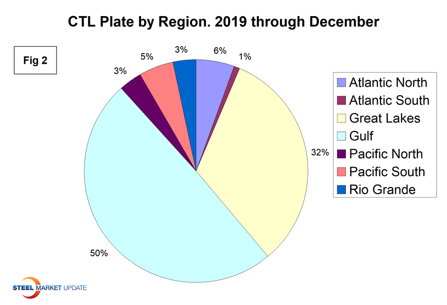 These six reports are intended to be reference documents with very few specific comments. The charts tell the whole story. Our intent is to provide buyers and sellers with an understanding of what is going on in their region of operation. Figure 1 shows the YTD tonnage of cut to length plate into each region and the huge variation between them. Figure 2 presents the same data as a pie chart. The highest volume regions in 2019, YTD December, were the Gulf and the Great Lakes, which accounted for 49.4 and 32.5 percent of the total, respectively.