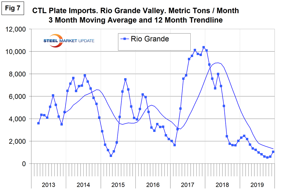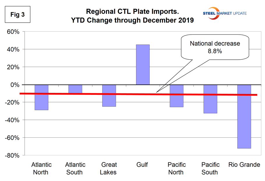 Total cut to length plate imports, YTD December, were down by 8.8 percent and decreased in all regions except the Gulf, which was up by 45.1 percent. The Rio Grande was down by 72.2 percent.