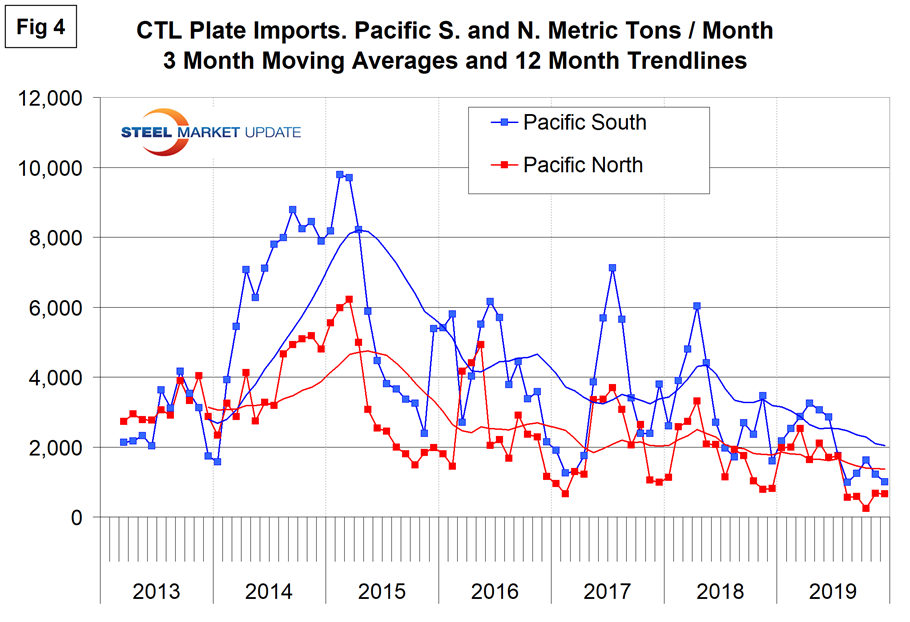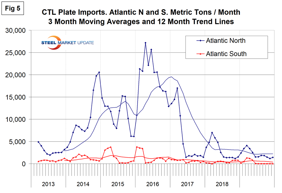 Figures 4, 5, 6 and 7 show the history of cut to length plate imports by region since March 2013 on a three-month moving average basis. Note, the Y axis scales are not the same.