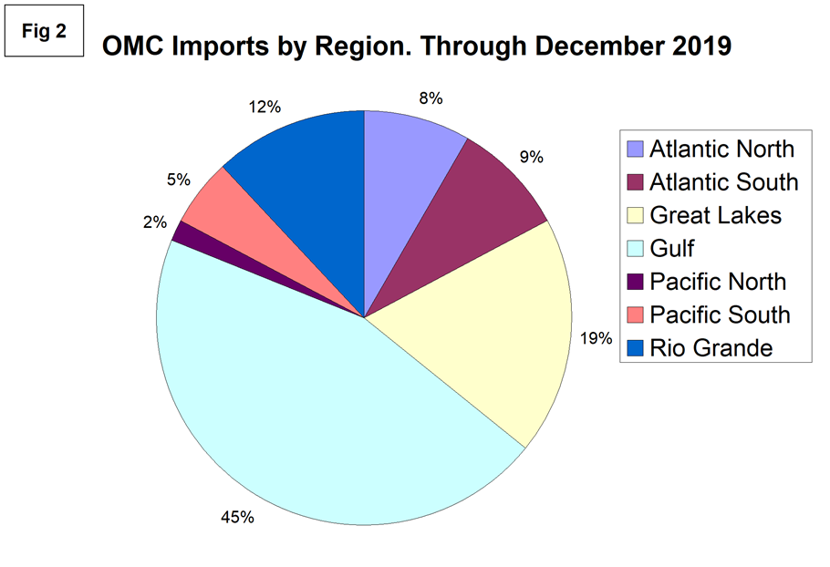 These six reports are intended to be reference documents with very few specific comments. The charts tell the whole story. Our intent is to provide buyers and sellers with an understanding of what is going on in their region of operation. Figure 1 shows the YTD tonnage of other metallic coated sheet into each region and the huge variation between them. Figure 2 presents the same data as a pie chart. By far the highest volume region in 2019, YTD December, was the Gulf, which accounted for 45.2 percent of the total. The whole Pacific coast received minimal tonnage.