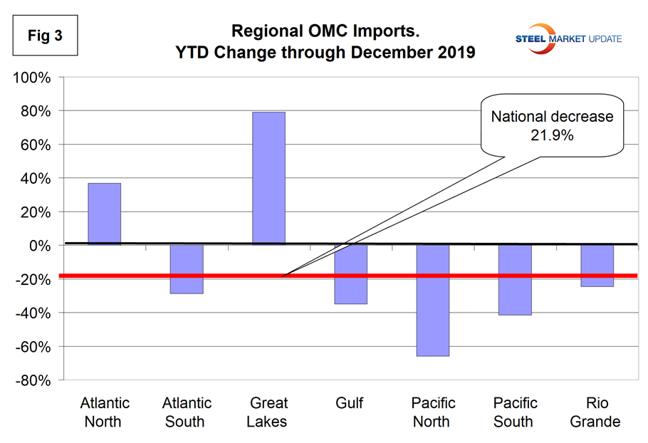 Total other metallic coated imports, YTD December, were down by 21.9 percent and decreased in all regions except the Great Lakes and North Atlantic, which were up by 79.1 percent and 36.8 percent, respectively. The Gulf region was down by 34.9 percent.