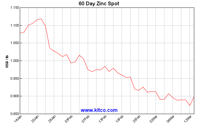Zinc spot prices have been falling steadily over the past two months, dropping nearly a quarter since late-January. According to Kitco.com, the spot price was $0.8987 per pound as of Friday.