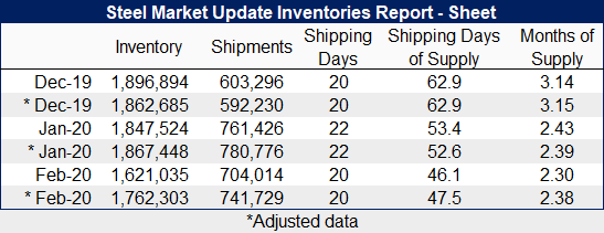 As prices eroded in February, service centers further reduced their flat rolled inventories 4.6 percent month on month by month’s end, according to adjusted February data compared with January’s final. With 20 shipping days in February compared to January’s 22, shipments decreased by only 2.6 percent. The result was a significant reduction in the shipping days of supply, which dropped to 47.5 days in February from 53.4 in January. Flat rolled inventories at service centers represented 2.38 months of supply at the end of February, compared to 2.43 in January.