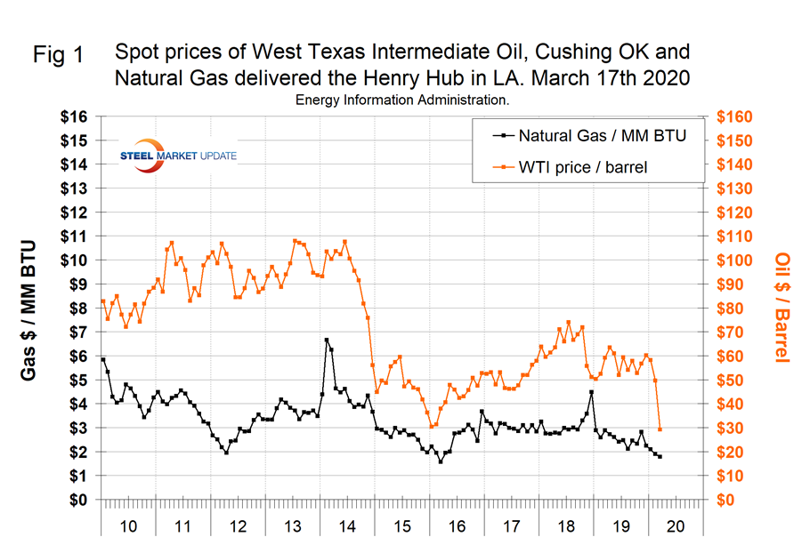 Normally our price data comes from the Energy Information Administration (EIA), but their data is not keeping up with today’s collapsing market. Their latest was March 6 when they published a price of $42.24 per barrel for WTI. This month we researched commodity prices from Markets Insider, which publishes trading prices by the second. On the morning of March 17, the price was $29.16 for WTI and $29.25 for Brent. The price of natural gas published by Markets Insider on Tuesday morning was $1.78/MM BTU at the Henry Hub in Louisiana, which was only a few cents below the price published by the EIA for March 6. The price of gas is not collapsing.