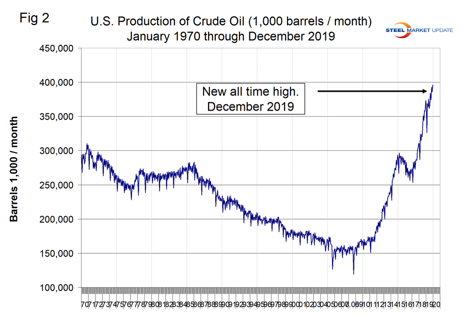 In the light of today’s market volatility, it doesn’t seem appropriate to publish our normal data, which is well behind the curve. One item that seems incredibly historic at the moment is that U.S. oil production set another all-time record in December (latest data) of 396 million barrels for the month as shown in Figure 2.