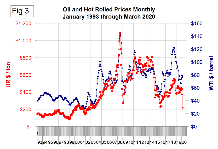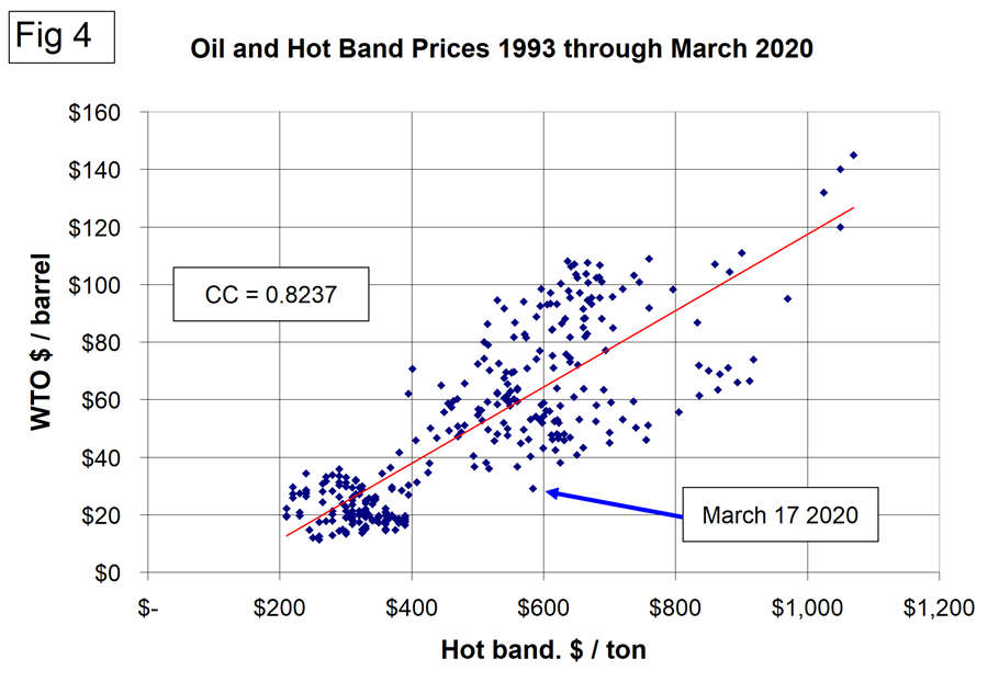 This week we were asked by a subscriber to examine the relationship between the prices of oil and hot band, which we have done and present here as Figures 3 and 4.