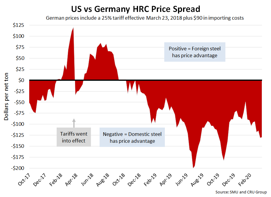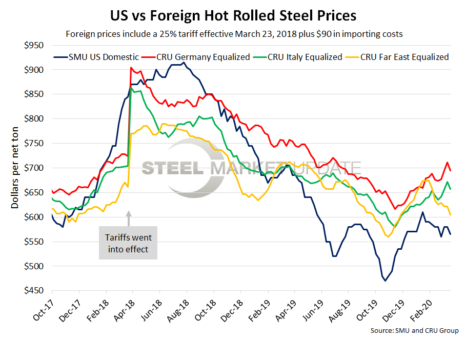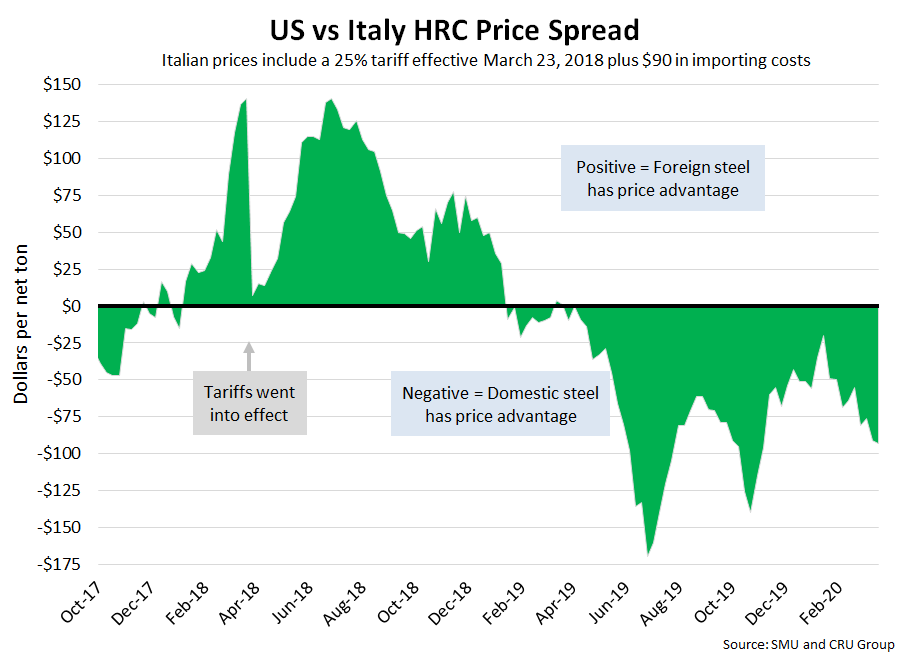 SMU includes a 25 percent import tariff effective on foreign prices after March 23, 2018. We then add $90 per ton to the foreign prices in consideration of freight costs, handling, trader margin, etc., to provide an approximate “CIF U.S. ports price” that can be compared against the SMU U.S. hot rolled price. Note that we do not include any antidumping (AD) or countervailing duties (CVD) in this analysis.