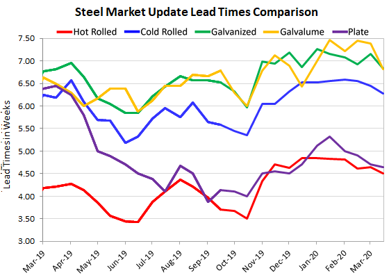 Lead times for spot orders of flat rolled and plate steel products showed initial signs of shortening this week, according to returns from Steel Market Update’s market trends questionnaire. Lead times for steel delivery are a measure of demand at the mill level—the longer the lead time, the busier the mill. The current lead times are still at healthy levels, comparable to where they were at this time last year, but they are slightly shorter than they were at the beginning of March.