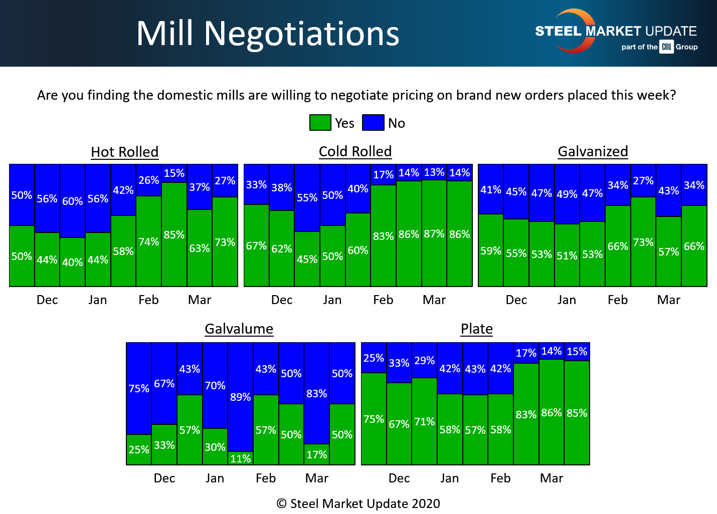 Steel producers and distributors told Steel Market Update this week that they remain busy serving customers, despite the disruption to the economy from the coronavirus. Not surprisingly, the mills appear very willing to negotiate spot prices to keep business flowing. The majority of service center and manufacturing executives responding to SMU’s questionnaire on Monday and Tuesday said the mills are talking price on all types of products.