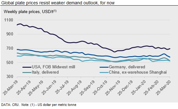 In Europe, all but two flat product prices declined between €2-10 /t. New business is low or zero. Many buyers have stepped back and will now look to wait for as long as possible before placing new orders with mills. End-users are closing by the day and in Italy all non-essential businesses have been shut since a government decree on Sunday. Nearly 20 Mt of EU flat products capacity is shutting down. Mills have so far announced a combined total of 18.7 Mt of cuts and the remaining mills are reducing minimum run rates. This does not include the 3.7 Mt already idled in H2 2019. Supply cuts should match demand shortage, but we expect European developments will follow what happened in China as supply takes longer to shut down, creating oversupply and pressuring prices. Although European prices show little movement, price indicators elsewhere show declines. Iron ore fines 62% Fe CFR China has fallen by $9.5 /t in a week to $81 /t. HMS 80:20 scrap CFR Turkey is now around $225-230 /t, down $40 /t in two weeks. HR coil prices in Turkey were offered $20 /t lower last week and falls in CIS export offers were greater than this.