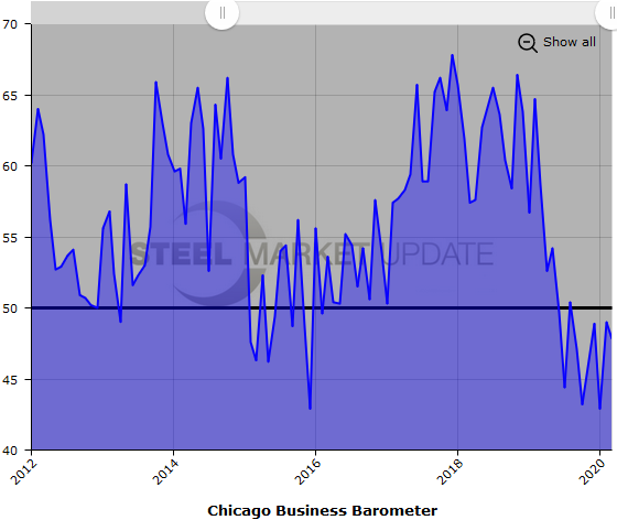 Below is a graph showing the history of the Chicago Business Barometer. You will need to view the graph on our website to use its interactive features; you can do so by clicking here. If you need assistance logging in to or navigating the website, please contact us at info@SteelMarketUpdate.com.