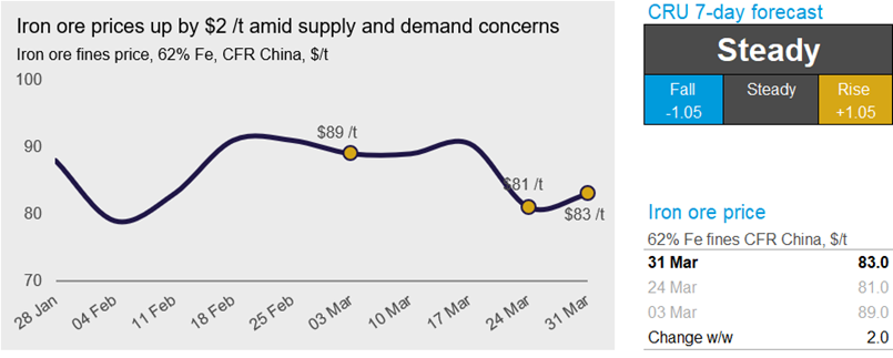 Last week iron ore prices increased, supported by news of mining bans in Canada and South Africa before being pulled down due to the worsening global demand outlook after the spread of the COVID-19 pandemic led governments around the world to adopt containment measures. On Tuesday, March 31, CRU assessed the 62% Fe fines price at $83.0 /t, $2 /t higher w/w.