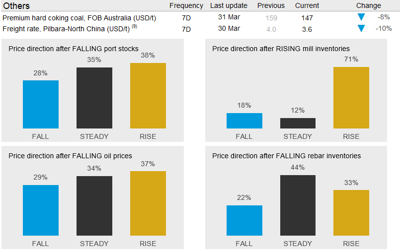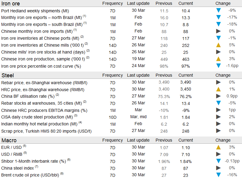 Oil prices fell further last week, assessed at $23 /bbl on March 30. This contributes to reducing freight rates and keeping iron ore production costs low.