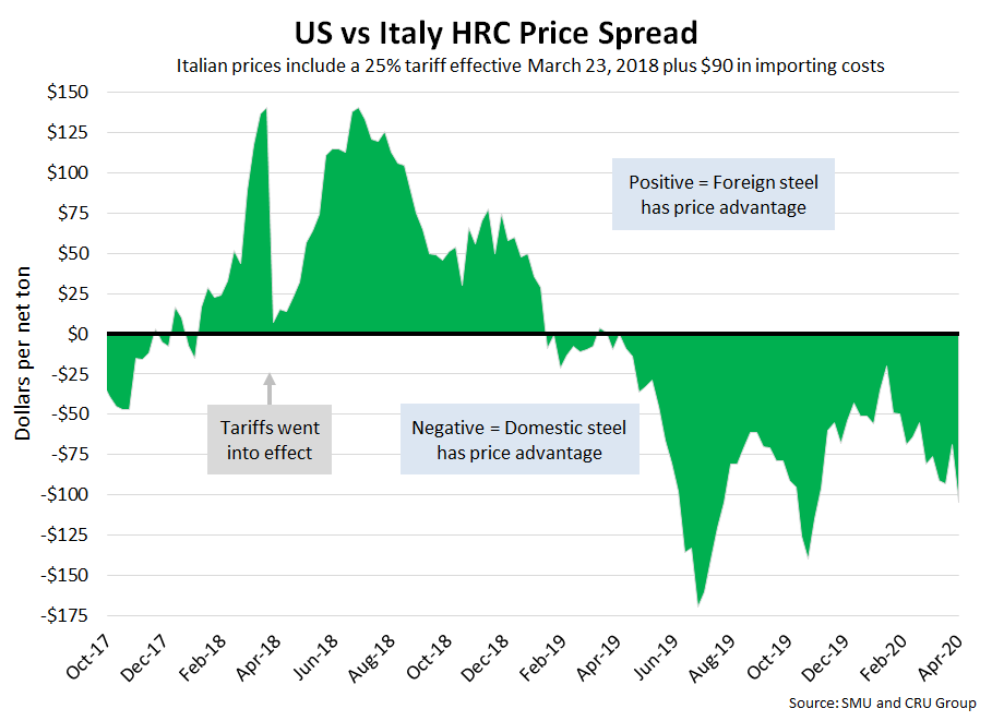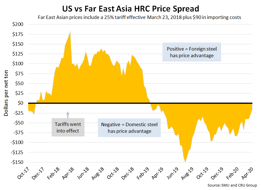 SMU includes a 25 percent import tariff effective on foreign prices after March 23, 2018. We then add $90 per ton to the foreign prices in consideration of freight costs, handling, trader margin, etc., to provide an approximate “CIF U.S. ports price” that can be compared against the SMU U.S. hot rolled price. Note that we do not include any antidumping (AD) or countervailing duties (CVD) in this analysis.