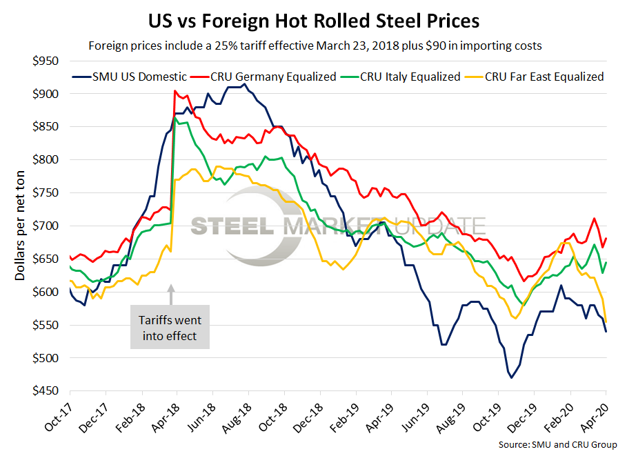 As of Wednesday, April 1, the CRU German HRC price was $473 per net ton, up $11 over the previous week, but down $11 from two weeks prior. Adding tariffs and import costs, that puts the German price at $681 per ton delivered to the U.S. The latest SMU hot rolled price average is $540 per ton, down $20 per ton over last week and down $25 over two weeks prior. Therefore, domestically sourced HRC is theoretically $141 per ton cheaper than imported German HRC; the spread was $108 last week and $130 two weeks ago. U.S. prices have held this price advantage for almost 16 consecutive months.
