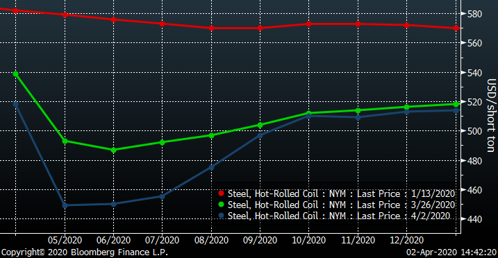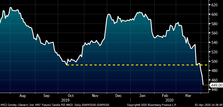 Today’s sell off in HRC futures is opening all kinds of opportunities to lock in prices for later this year, especially considering there is serious upside risk if demand returns with so much supply taken out of the system. Perhaps these prices aren’t attractive enough for you, but then what price is? Perhaps $400 tons for Q3 is the right price. Regardless, you might get the opportunity to lock in steel in the futures market at deeply discounted prices. It might trade there for a day or two and then just like $20/bbl oil, poof! You missed the boat. Think optimistically, think opportunistically, think big and, most importantly, stay safe!