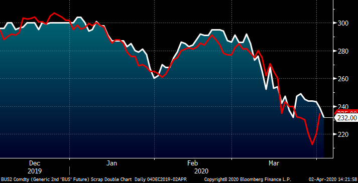 This chart shows CME busheling and LME Turkish scrap. Turkish scrap rebounded today after trading down to $212.50 yesterday, while May busheling traded as low as $220 today.