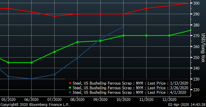 Until today, the busheling curve has held up relatively well throughout much of this. The curve has shifted into a steep contango, which is interesting considering the complications that are about to occur with the Army Corps of Engineers set to start work on the Mississippi River in July. Barges will be next to impossible to come by in June as their owners will want them back below where the river will be shut down. That likely means significant difficulties acquiring scrap for some mills and a lot of scrap stuck in the Midwest this summer. Expectations were the mills would need to load up come May, but with the rapid changing market, fall-off in demand and uncertainty, how will mills address this issue? It looks like the project is happening either way, so what will this mean for those scrap prices over the summer, and why isn’t the curve reflecting that?