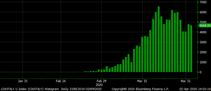 I have been watching Italy closely with the expectation that once the number of Italy’s new daily infections flattens and starts to trend lower, it will be a major turning point. The reassurance to the public that if Italy can accomplish getting the spread of the virus and their outbreak under control, then so can the U.S. and the rest of the world. This chart below shows Italy’s daily new infections and it looks to be headed in the right direction.